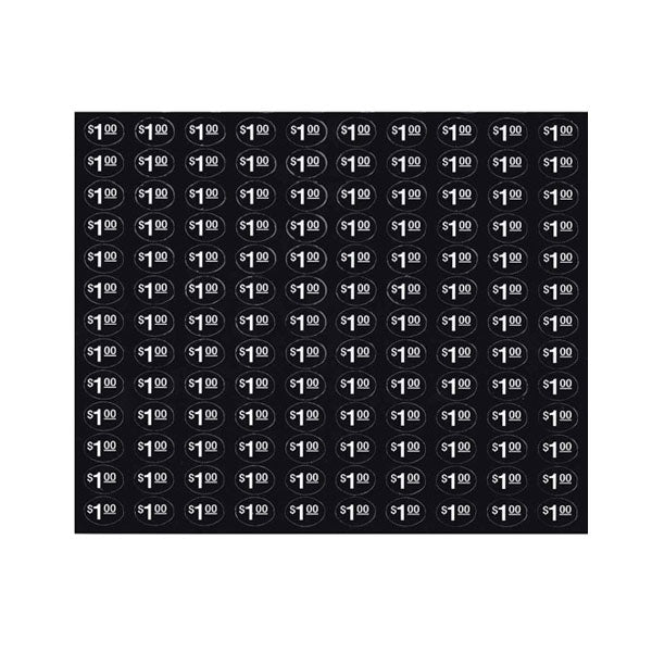 Generic } Generic Price Labels } Fits Soda/Snack } Stick On Black } $1.00 Labels } Black } 3/4" X 9/16" } 130 Labels }