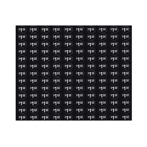 Generic } Generic Price Labels } Fits Soda/Snack } Stick On Black } $1.50 Labels } Black } 3/4" X 9/16" } 130 Labels }